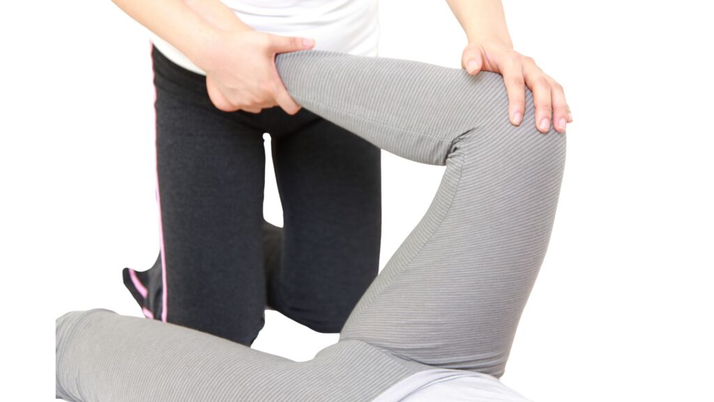 やり方:下図のように股関節と膝が90°にセッティングをし、膝を内側と外側にねじります。